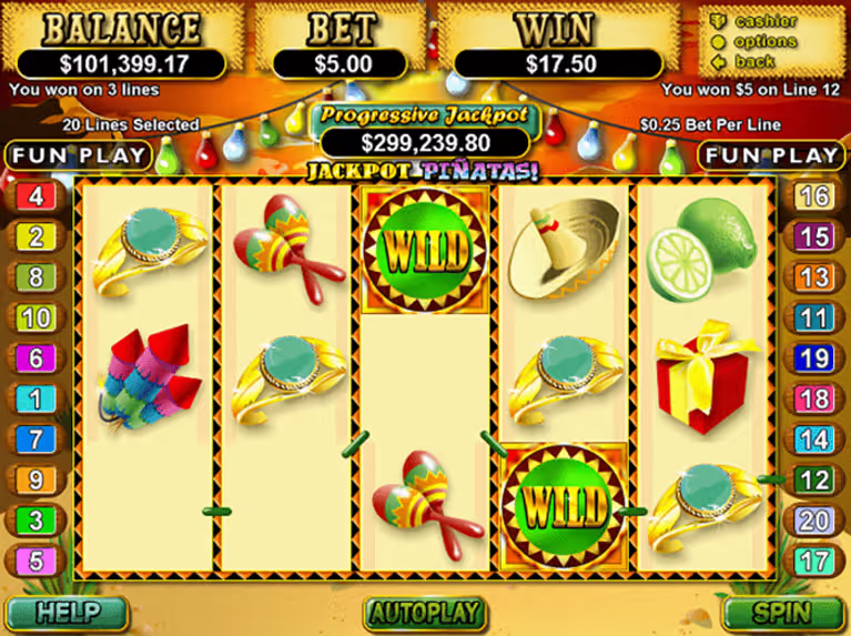 When you're ready to play slots game for real money or just for fun, look to online casinos. Jaclpot Pinataas Slots is available at many online casinos. Look for casinos that have lots of different slots games and look for the one with the bright colors, the fun music and all the pinatas.